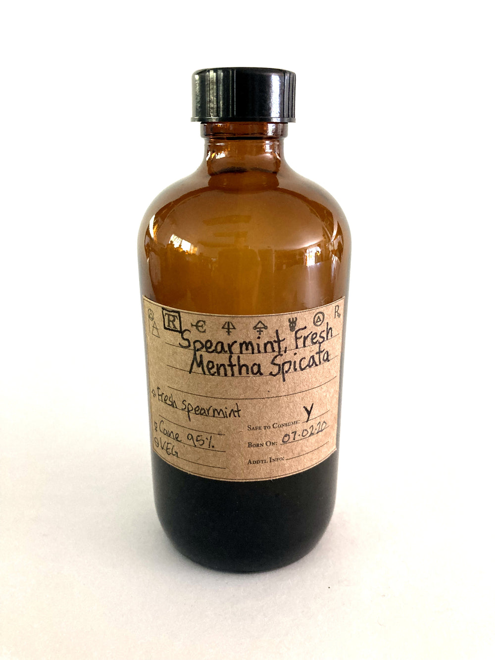 The Spearmint was immediately tinctured in Ethanol within moments of harvesting it, concentrating the Volatile Sulfur, Fixed Sulfur, and Phlegm of the Fresh Biomass. The Spagyric Tincture of Fresh Spearmint DOES contain the Phlegm [plant juices] from the Fresh Plant along with the Fixed Sulfur and whatever amount of naturally-occurring Volatile Sulfur [volatile oils] the fresh biomass contained. As with all our Spagyric Products, it has been macerated with a heaping supply of Vegetable Salt [pure 99.8%+ Potassium Carbonate] to ensure maximum iatrochemical reaction and potency. Within the context of Spagyria, this item of Pharmacopoeia would be used to address Imbalances of Ens Naturale pertaining to the known uses of Spearmint.