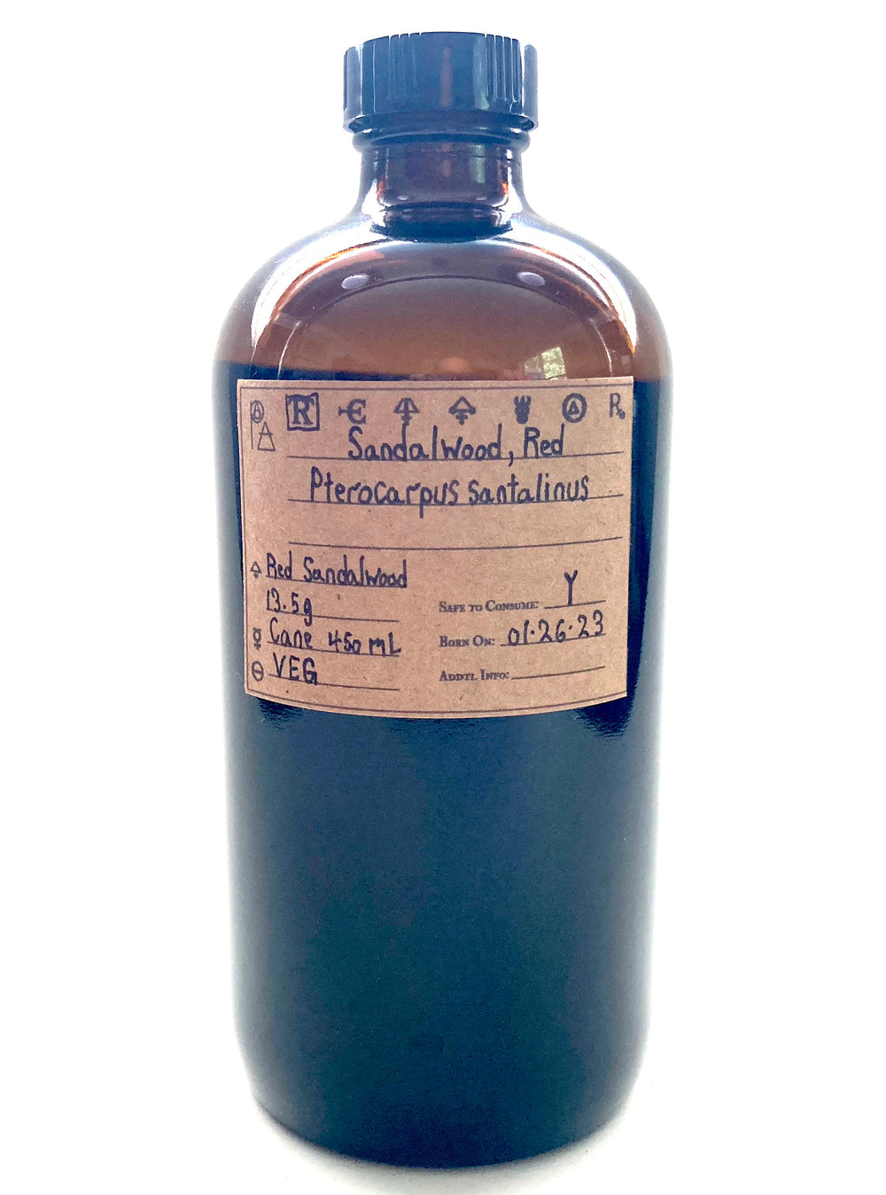 This Red Sandalwood Spagyric Tincture is made with the Red Sandalwood tree. Pterocarpus santalinus is also known as red sanders, chenchandanam, or saunderswood. Our Spagyric Tinctures are made with Organic, Ecodynamic, or Wildharvested Biomass and Tinctured with Organic Cane Spirits as our Veg Mercury. Once the tincture was made, we add Spagyric Salt of Salt of the Vegetable Kingdom and digest until reactions have stopped.
