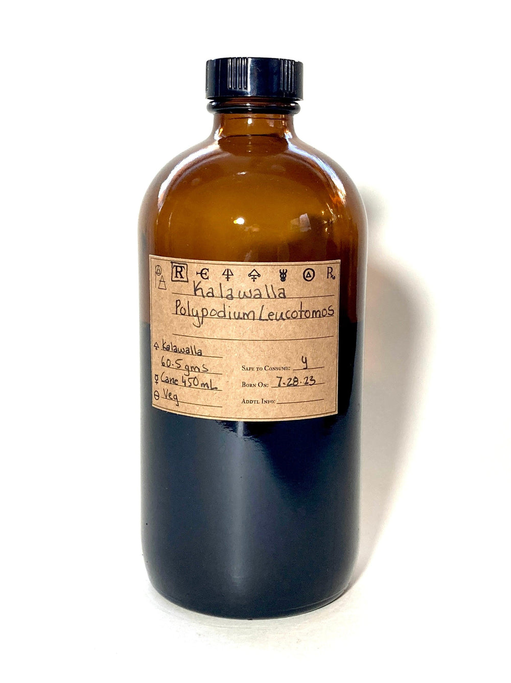 This Kalawalla Spagyric Tincture is made with the Kalawalla plant. Polypodium leucotomos is also known as samambaia, calaguala, golden polypody, cabbage palm fern, or golden serpent fern. Our Spagyric Tinctures are made with Organic, Ecodynamic, or Wildharvested Biomass and Tinctured with Organic Cane Spirits as our Veg Mercury. Once the tincture was made, we add Spagyric Salt of Salt of the Vegetable Kingdom and digest until reactions have stopped.